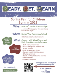 Calling all future SD 19 students born in 2022! We will once again be hosting Ready, Set Learn in the BVE gymnasium on Wednesday, March 4th from 4:00-6:00. This is a great chance to meet SD 19 Principals and Kindergarten teachers and get to know our community partners. Use the QR code to register and order your take-home pizza!